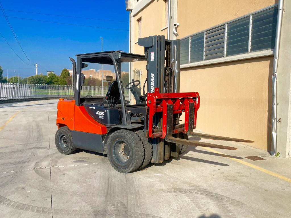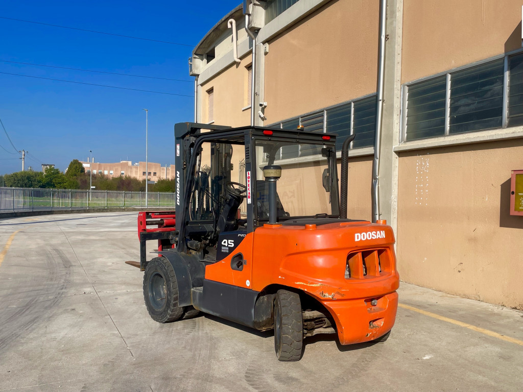 Carrelli diesel usati di marca Doosan modello D45S-5 Posizionatore con propulsione Diesel, portata 45 q.li, altezza di sollevamento 5000 mm, in vendita. Occasione a € 15.000.