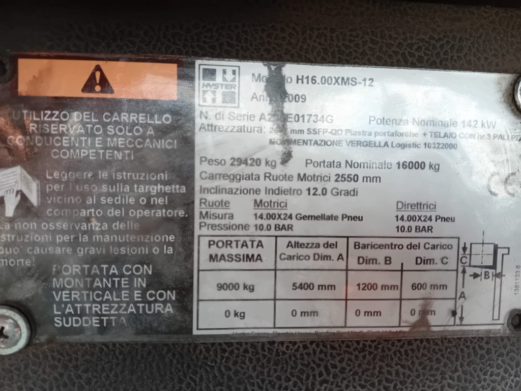 Carrelli diesel usati di marca Hyster modello H16.00XMS-12 con propulsione Diesel,  portata 160 q.li,  altezza di sollevamento 5300 mm,  in vendita. Occasione.