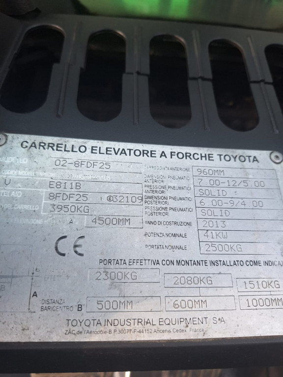 carrello elevatore Toyota diesel, portata 25 q anno 2013, modello 8FDF25, montante ingombro 280cm alzata 450cm, con certificato CE