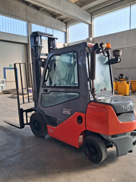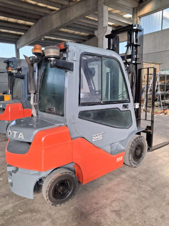 Carrelli diesel usati di marca Toyota modello 06-8FD25F con propulsione Diesel, portata 25 q.li, altezza di sollevamento 4000 mm, in vendita. Occasione.
