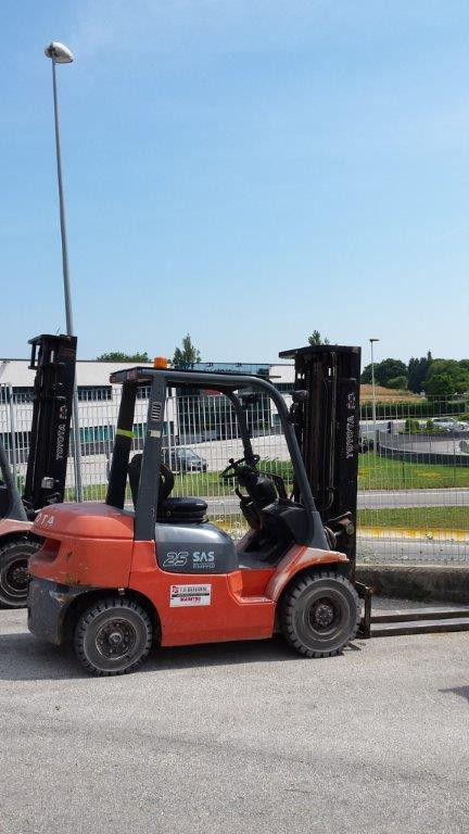 Carrelli diesel usati di marca Toyota modello 7FDF25 con propulsione Diesel, portata 25 q.li, altezza di sollevamento 5500 mm, in vendita. Occasione a € 12.000.