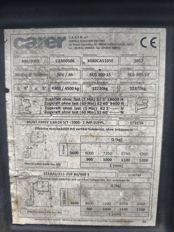 Carrelli elettrici usati di marca Carer modello A80/900X con propulsione Elettrica,  portata 80 q.li,  altezza di sollevamento 3600 mm,  in vendita. Occasione.