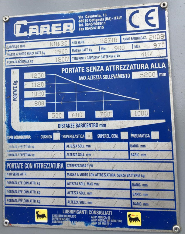 Carrelli elettrici usati di marca Carer modello N18.3S con propulsione Elettrica, portata 18 q.li, altezza di sollevamento 5200 mm, in vendita. Occasione a € 10.500.