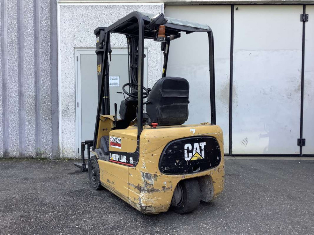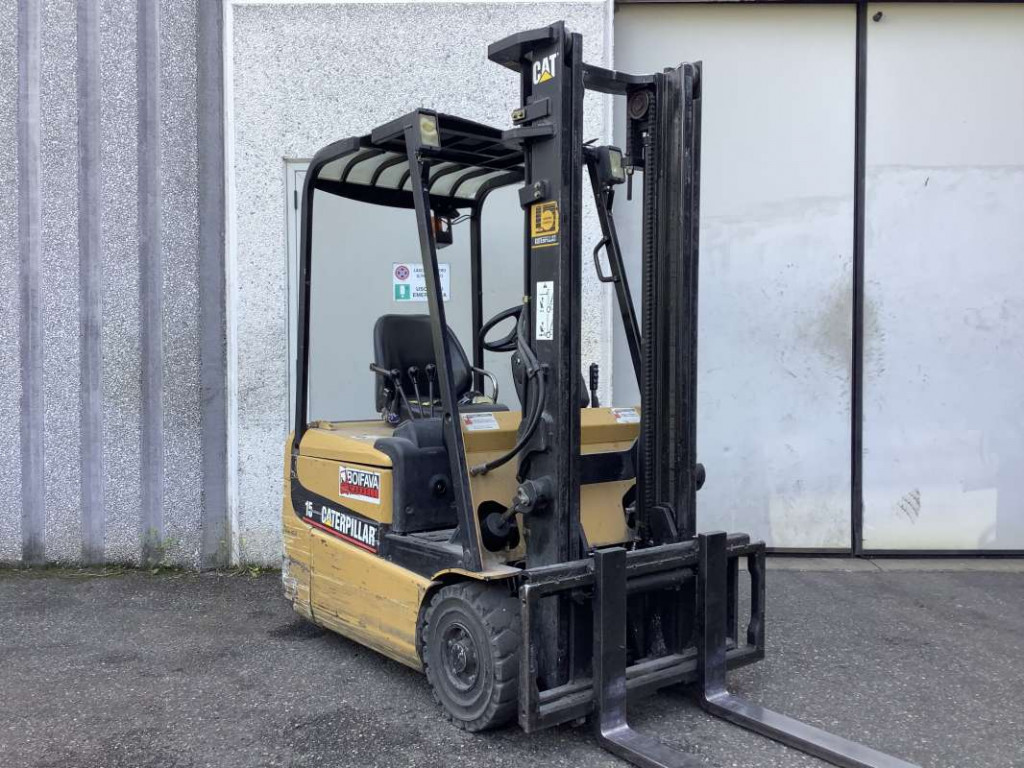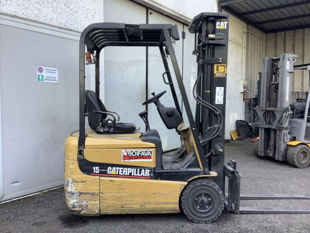 Carrelli elettrici usati di marca Caterpillar modello EP15KRT con propulsione Elettrica, portata 15 q.li, altezza di sollevamento 3300 mm, in vendita. Occasione a € 6.800.