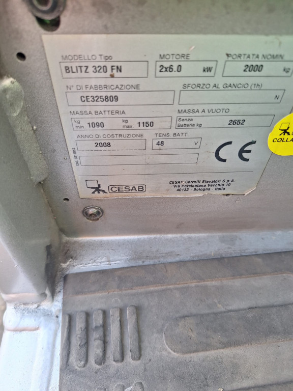 Carrelli elettrici usati di marca Cesab modello BLITZ 320 con propulsione Elettrica, portata 20 q.li, altezza di sollevamento 4505 mm, in vendita. Occasione a € 5.000.