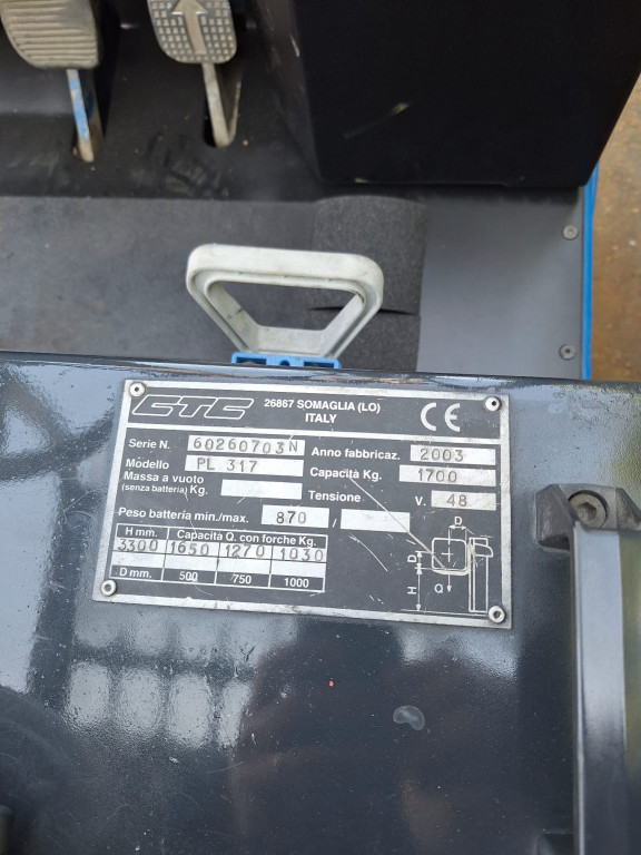 Carrelli elettrici usati di marca CTC modello PL 317 con propulsione Elettrica, portata 17 q.li, altezza di sollevamento 3300 mm, in vendita. Occasione a € 5.500.