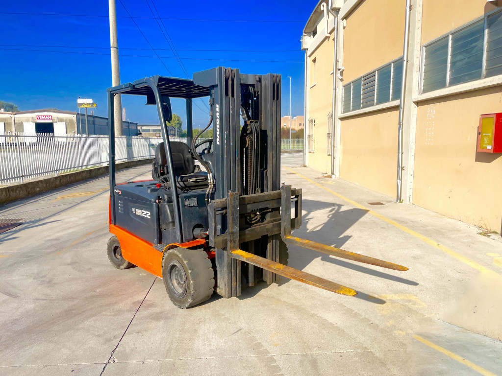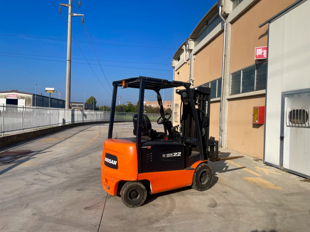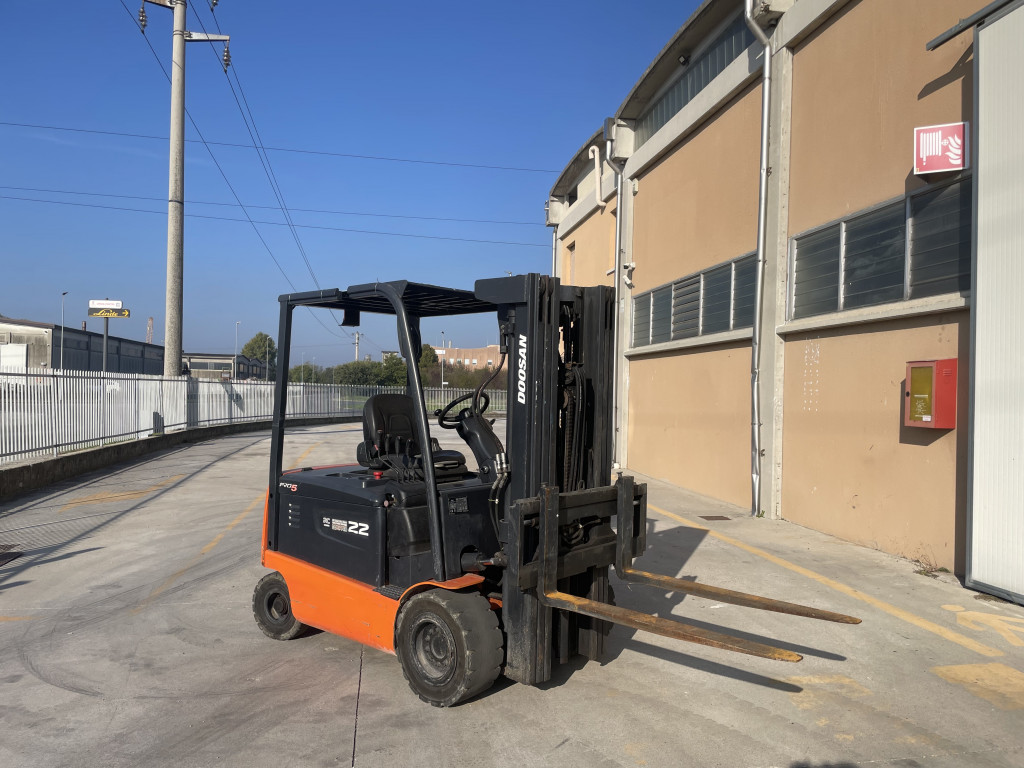 Carrelli elettrici usati di marca Doosan modello B22X-5 con propulsione Elettrica, portata 22 q.li, altezza di sollevamento 4730 mm, in vendita. Occasione a € 8.000.