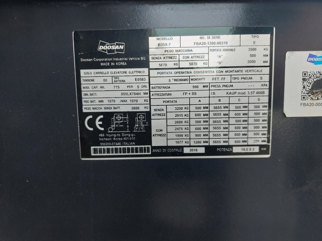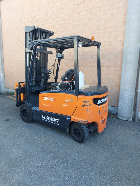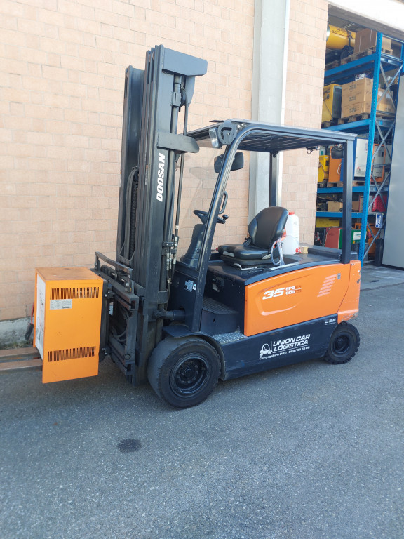 Carrelli elettrici usati di marca Doosan modello B35X-7 con propulsione Elettrica, portata 35 q.li, altezza di sollevamento 5655 mm, in vendita. Occasione.