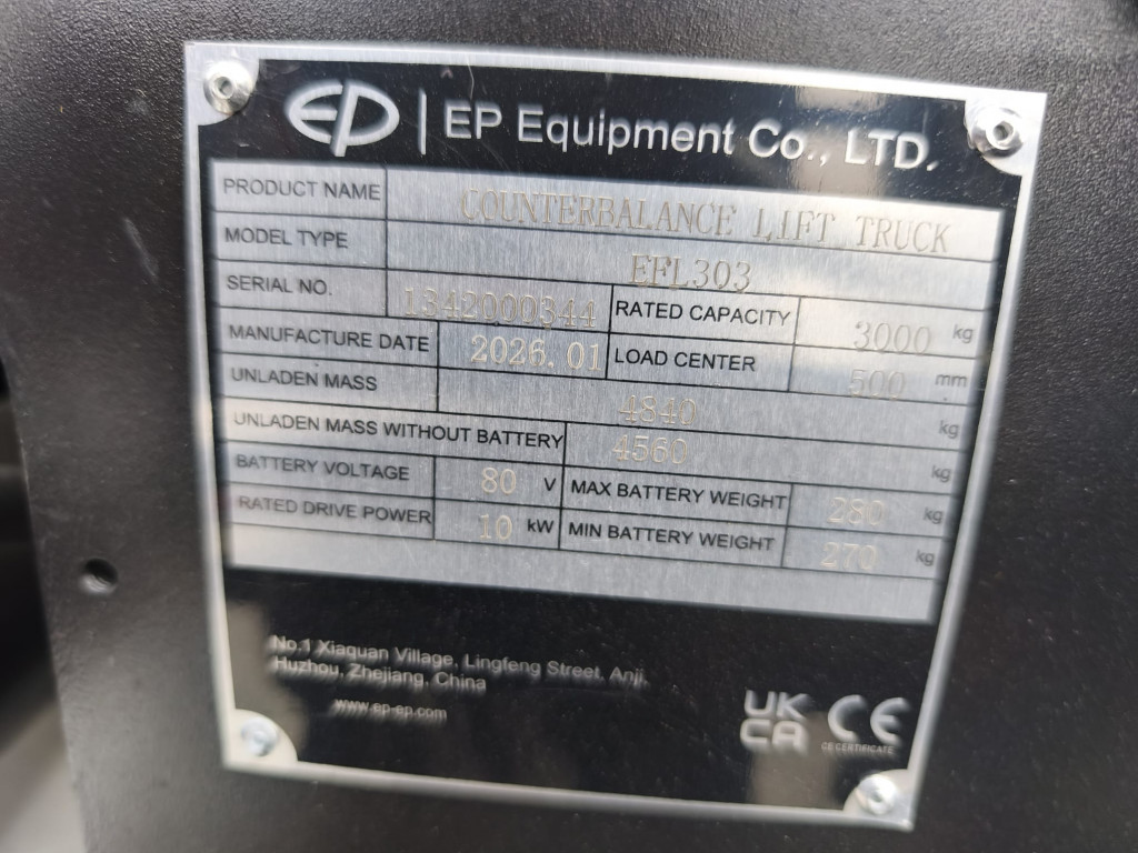 Carrelli elettrici usati di marca EP EQUIPMENT modello EFL303 con propulsione Elettrica, portata 30 q.li, altezza di sollevamento 4800 mm, in vendita. Occasione.