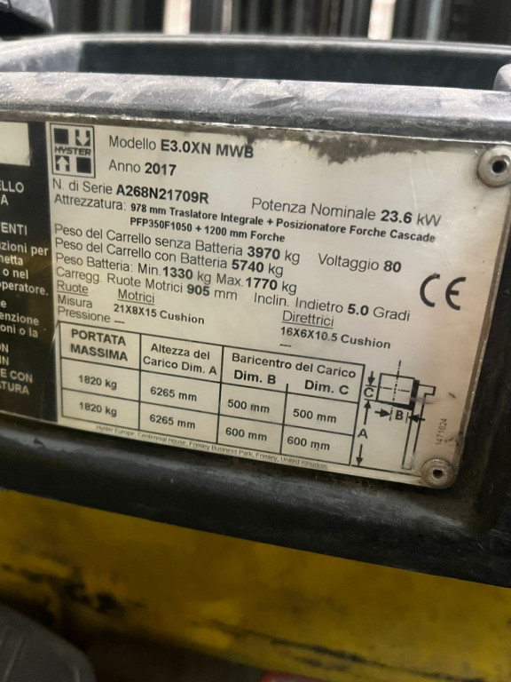 Carrelli elettrici usati di marca Hyster modello E3.0XN con propulsione Elettrica, portata 30 q.li, altezza di sollevamento 6265 mm, in vendita. Occasione.