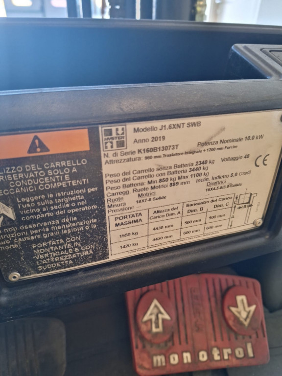 Carrelli elettrici usati di marca Hyster modello J 1.6XNT SWB con propulsione Elettrica, portata 16 q.li, altezza di sollevamento 4430 mm, in vendita. Occasione a € 11.500.