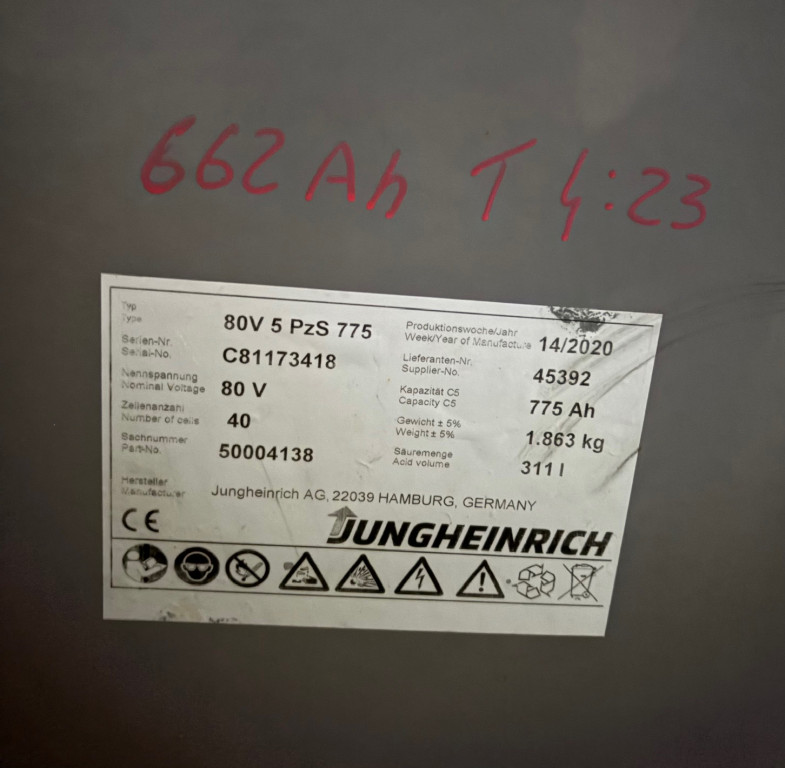 | Equipaggiamento | Caricabatterie, Semicabina, Tettuccio, Vetro anteriore, Vetro posteriore, Fari da lavoro anteriori, Lampeggiante, Cicalino, Funzione tartaruga, Pedale singolo, Tergicristallo, Specchio retrovisore, Freno a mano a pulsante, Estrazione batteria laterale, Idraulica supplementare doppia |