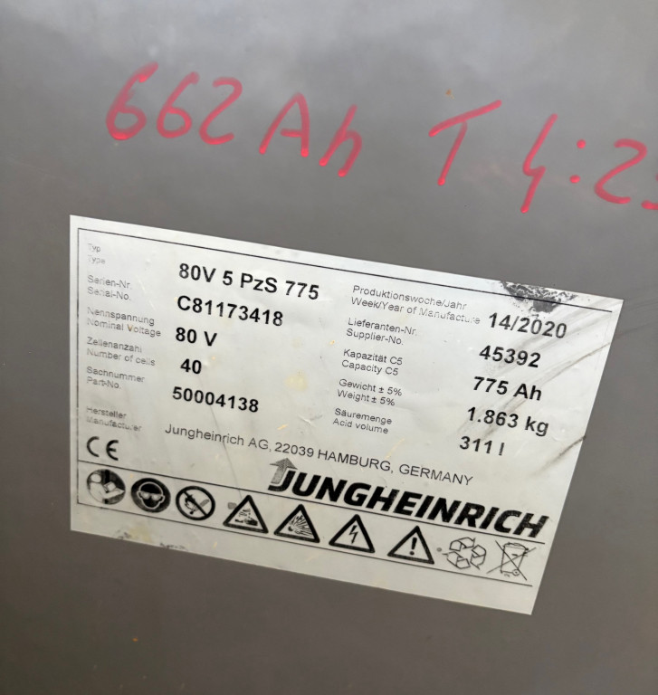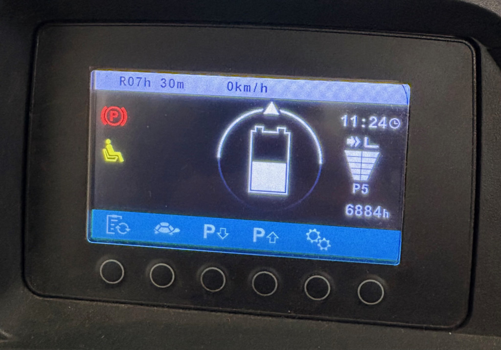 | Equipaggiamento | Caricabatterie, Semicabina, Tettuccio, Vetro anteriore, Vetro posteriore, Fari da lavoro anteriori, Fari da lavoro posteriori, Lampeggiante, Cicalino, Funzione tartaruga, Pedale singolo, Tergicristallo, Specchio retrovisore, Freno a mano a pulsante, Estrazione batteria laterale, Idraulica supplementare doppia |