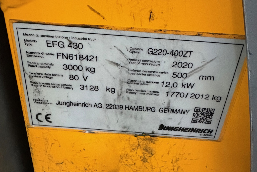 Carrelli elettrici usati di marca Jungheinrich modello EFG 430 con propulsione Elettrica, portata 30 q.li, altezza di sollevamento 4000 mm, in vendita. Occasione a € 19.500.