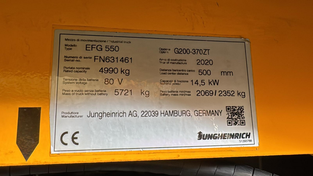 Carrelli elettrici usati di marca Jungheinrich modello EFG 550 con propulsione Elettrica, portata 49,9 q.li, altezza di sollevamento 3700 mm, in vendita. Occasione a € 30.700.