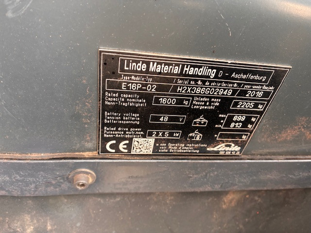 Carrelli elettrici usati di marca Linde modello E16P-02 con propulsione Elettrica, portata 16 q.li, altezza di sollevamento 3150 mm, in vendita. Occasione a € 9.500.