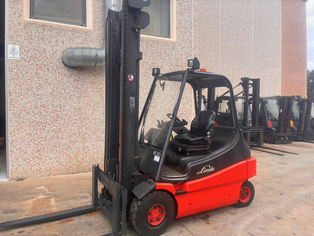 Carrelli elettrici usati di marca Linde modello E25-02 con propulsione Elettrica, portata 25 q.li, altezza di sollevamento 4500 mm, in vendita. Occasione a € 11.000.