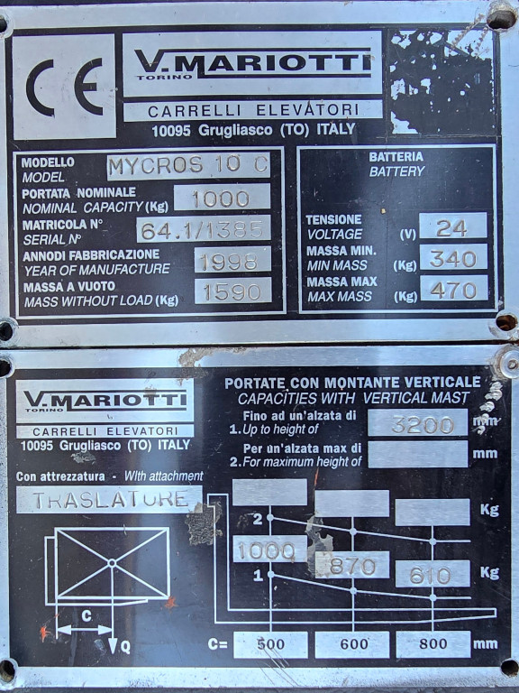 Carrelli elettrici usati di marca Mariotti modello mycros10c con propulsione Diesel, portata 10 q.li, altezza di sollevamento 3200 mm, in vendita. Occasione a € 6.500.