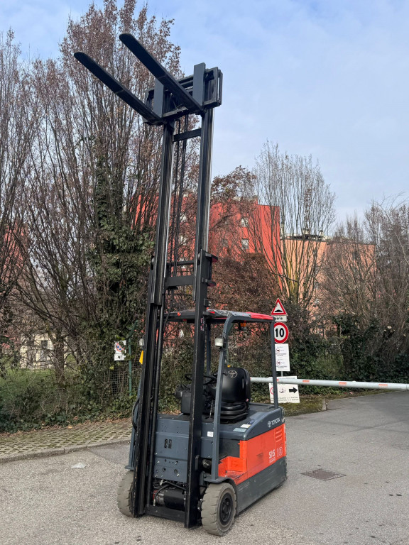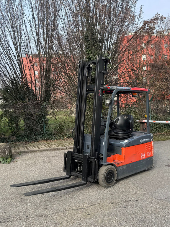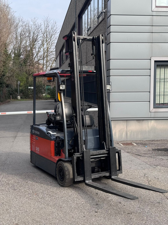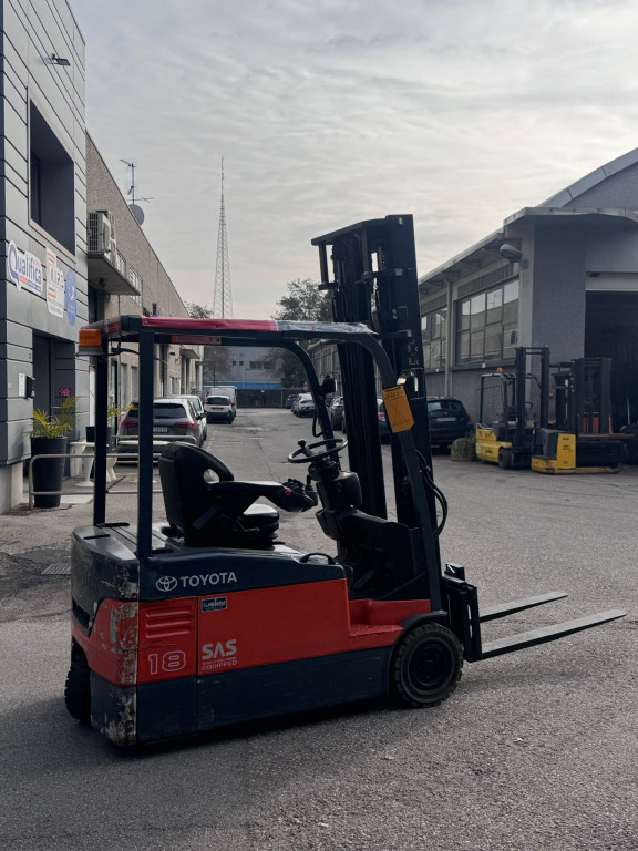 Carrello elevatore frontale elettrico usato, marca Toyota modello 7-FBEF-18. Altezza di sollevamento 4000mm montante Duplex, portata massima 1800 Kg, propulsione elettrica, batteria in ottimo stato, 3 ruote superelastiche, ruota motrice posteriore nuova, anno di fabbricazione 2008. Completo di tutte i dispositivi di sicurezza, cicalino acustico per la retromarcia, specchio panoramico a 180°, lampeggiante, fari di lavoro anteriori, comandi con minileve . La macchina è provvista di manuale di uso e manutenzione