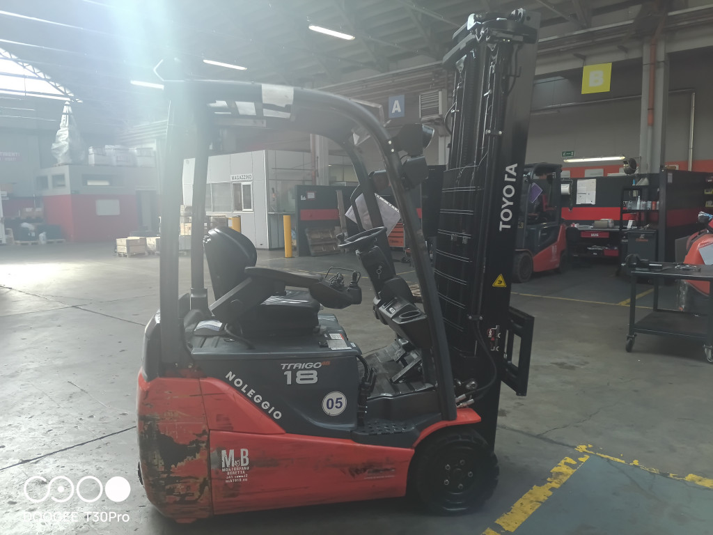 Carrelli elettrici usati di marca Toyota modello 8FBEKT18 con propulsione Elettrica, portata 18 q.li, altezza di sollevamento 5500 mm, in vendita. Occasione a € 11.900.