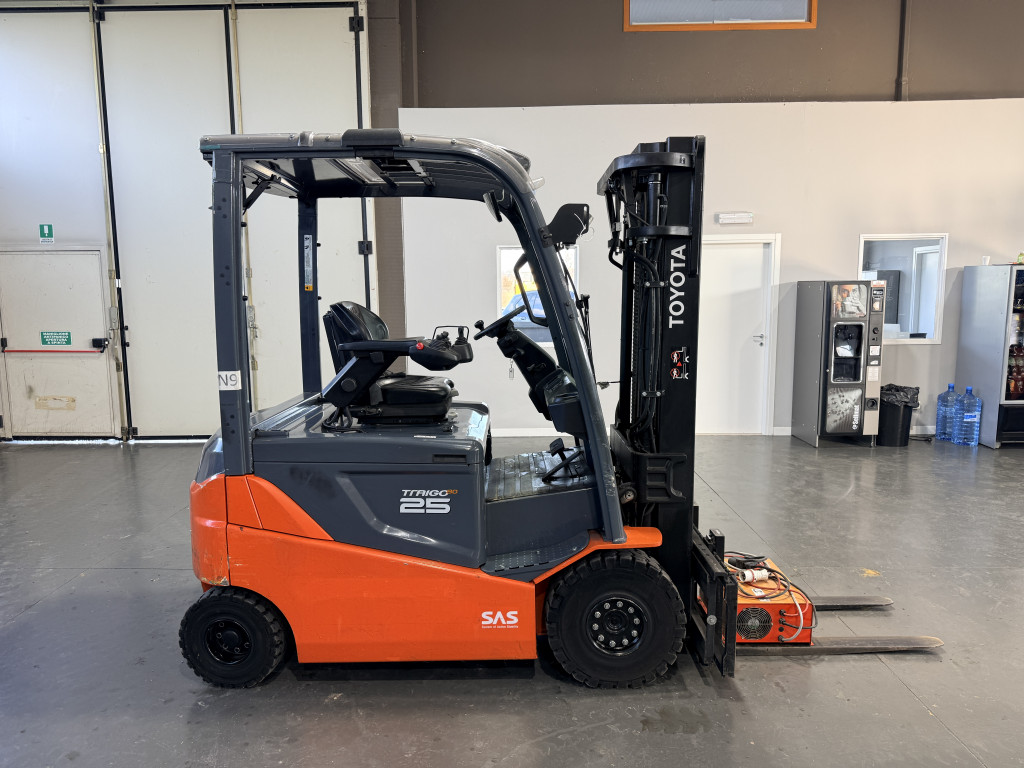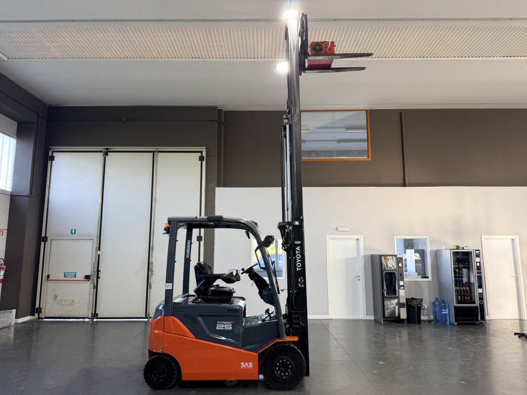 Carrelli elettrici usati di marca Toyota modello 8FBMT25 con propulsione Elettrica, portata 25 q.li, altezza di sollevamento 4700 mm, in vendita. Occasione a € 21.500.
