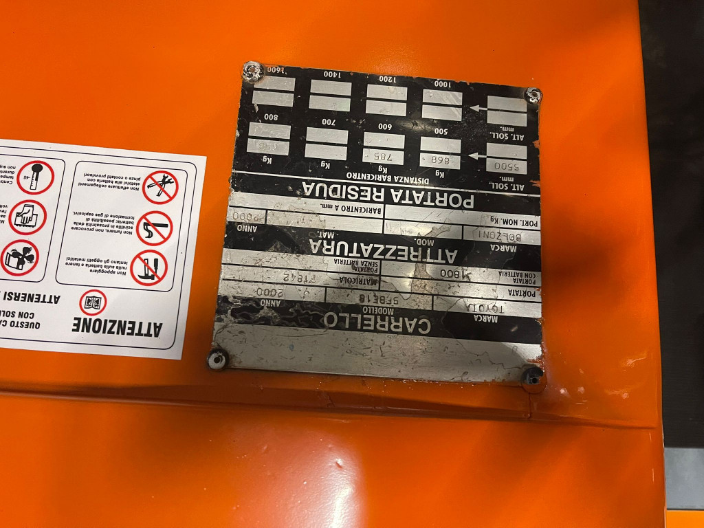 Toyota mod. FBE 18 anno 2000, sollevamento 5500 mm Triplex gal, traslatore, forche da 1200 mm, batteria trazione 48 V 600 Ah (autonomia certificata 64 %), rabbocco centralizzato, carica batterie trifase, gommatura SES, revisionata e riverniciata, lampeggiante, cicalino, cinture di sicurezza, certificato CE, garanzia integrale.