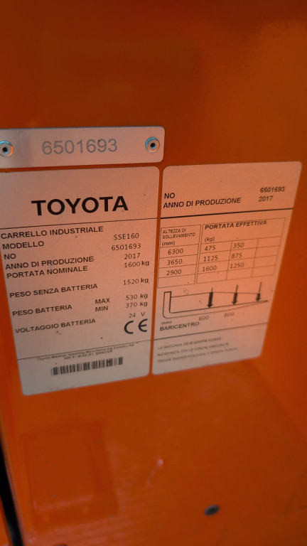 Carrelli retrattili a telaio standard di marca Toyota modello SSE160 con propulsione Elettrica, portata 16 q.li, altezza di sollevamento 6300 mm, in vendita. Occasione a € 5.000.