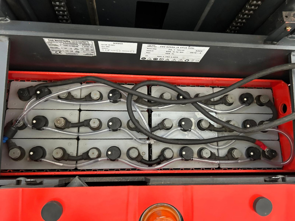 RICONDIZIONATO, montante duplex, forche 800 mm, cabina, batteria 24 V / 620 Ah - anno 2019, carica batterie 24V - 105 ah, 6.866 ore lavoro, 3 gomme vulkolan, dimensioni 985 mm x 1.720 mm, altezza alla cabina 2.330 mm, peso 2620 kg, matricola n° 615212G00266