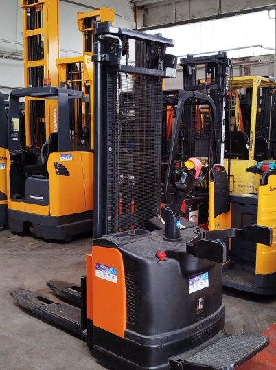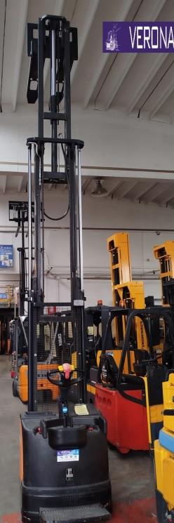 STOCCATORE CON PEDANA MOVIBILE ( SI PUO' UTILIZZARE SIA CON UOMO A BORDO CHE UOMO A PIEDI), PORTATA 1400 KG, ALTEZZA DI SOLLEVAMENTO 5500MM IN BUONO STATO.