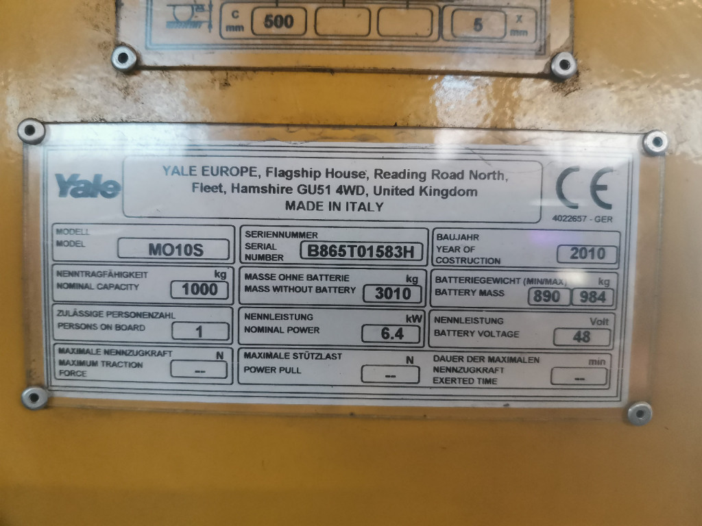 Stoccatori uomo a bordo di marca Yale modello MO10S con propulsione Elettrica, portata 10 q.li, altezza di sollevamento 8805 mm, in vendita. Occasione a € 2.500.