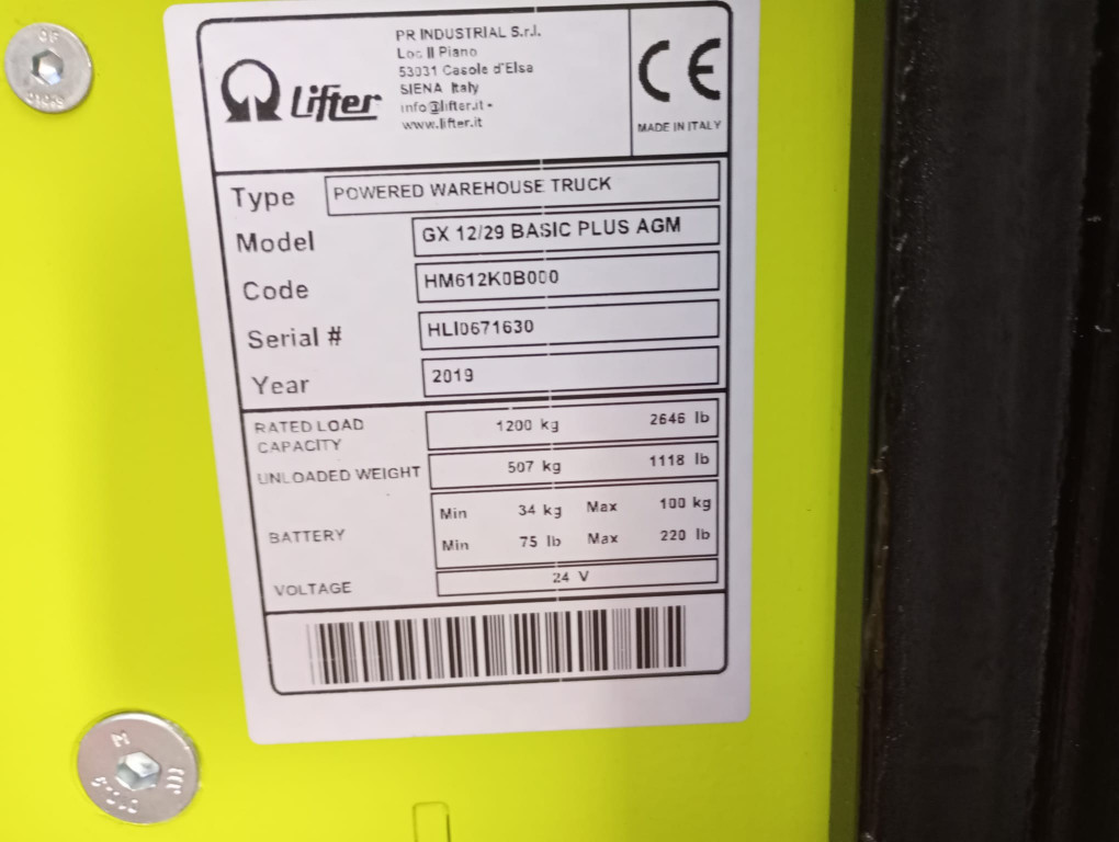 Stoccatori uomo a piedi di marca Lifter modello GX 12/29 con propulsione Elettrica, portata 12 q.li, altezza di sollevamento 2900 mm, in vendita. Occasione a € 3.500.