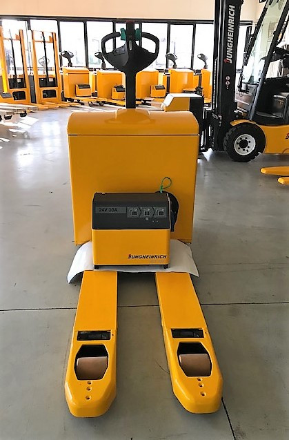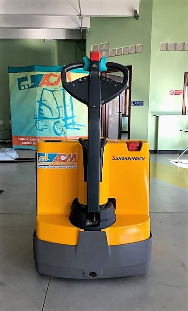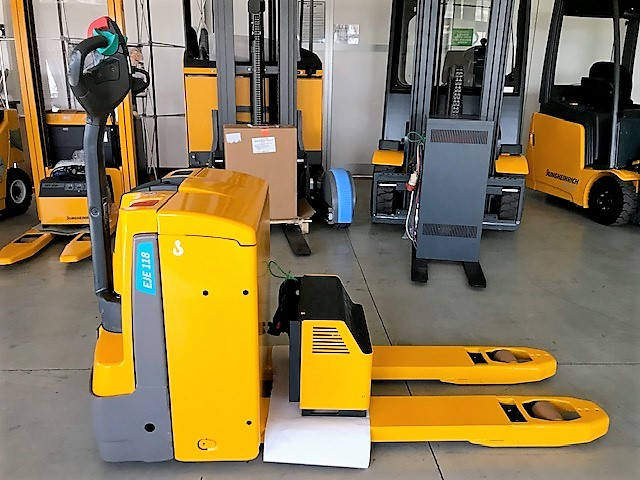 Transpallet elettrici uomo a terra di marca Jungheinrich modello EJE 118 con propulsione Elettrica, portata 18 q.li, altezza di sollevamento 150 mm, in vendita. Occasione a € 3.000.