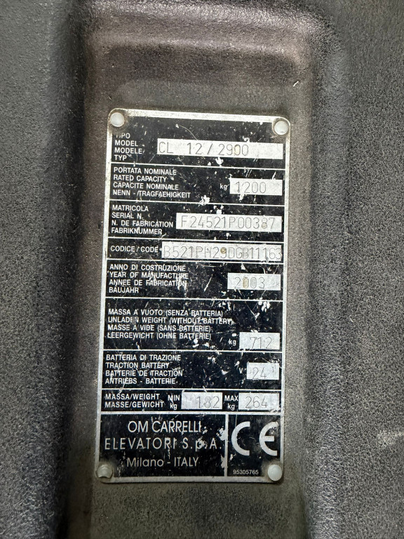 Carrello CL 12/2900 OM di tipo transpallet uomo a terra del 2003 con portata di 12 q.li e altezza di sollevamento 2.900 mm.