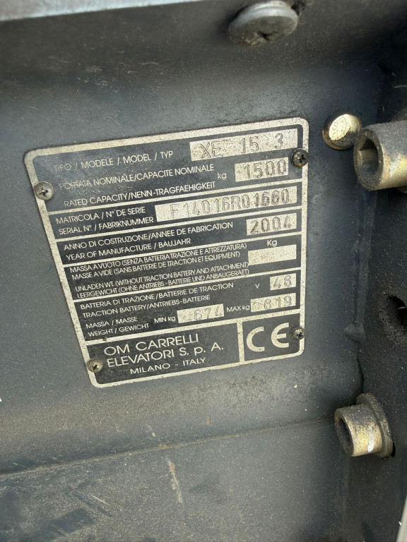 Carrello XE 15.3 OM di tipo carrelli frontali elettrici del 2004 con portata di 15 q.li e altezza di sollevamento 3.300 mm.