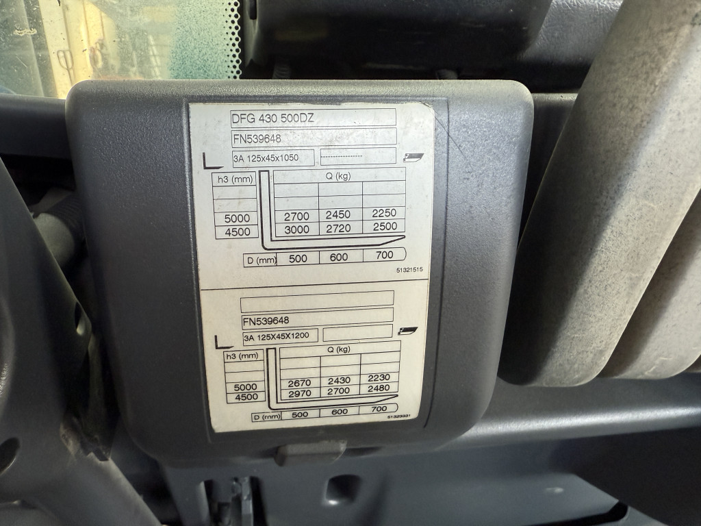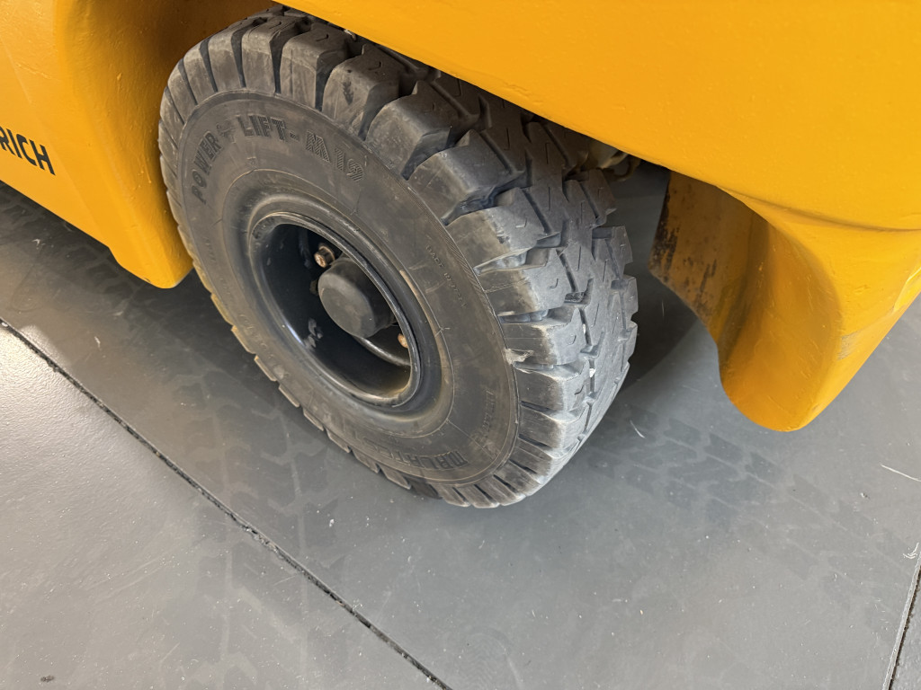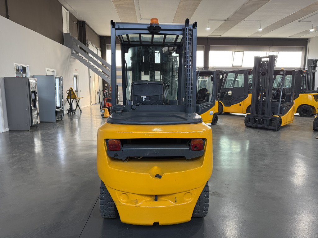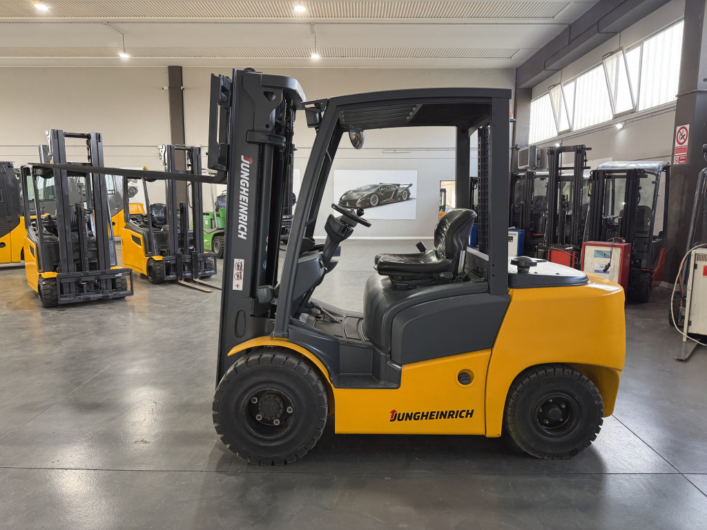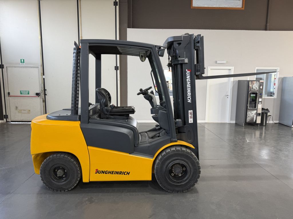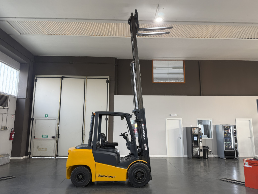 Carrelli diesel usati di marca Jungheinrich modello DFG 430 con propulsione Diesel, portata 30 q.li, altezza di sollevamento 5000 mm, a noleggio. Occasione.