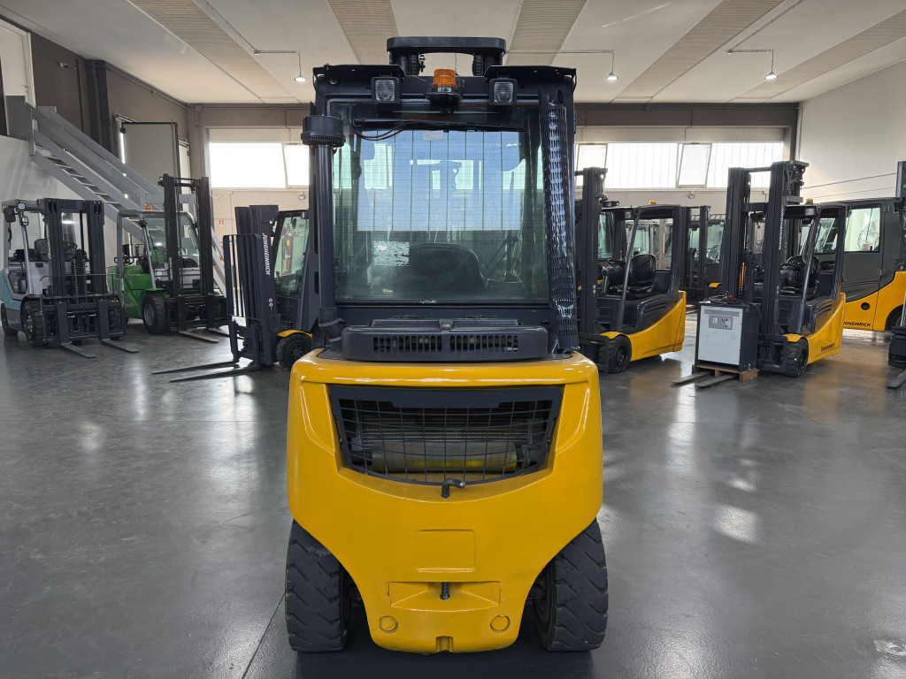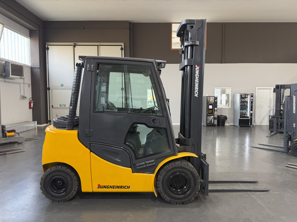 Carrelli diesel usati di marca Jungheinrich modello DFG 430s con propulsione Diesel, portata 30 q.li, altezza di sollevamento 4500 mm, a noleggio. Occasione.
