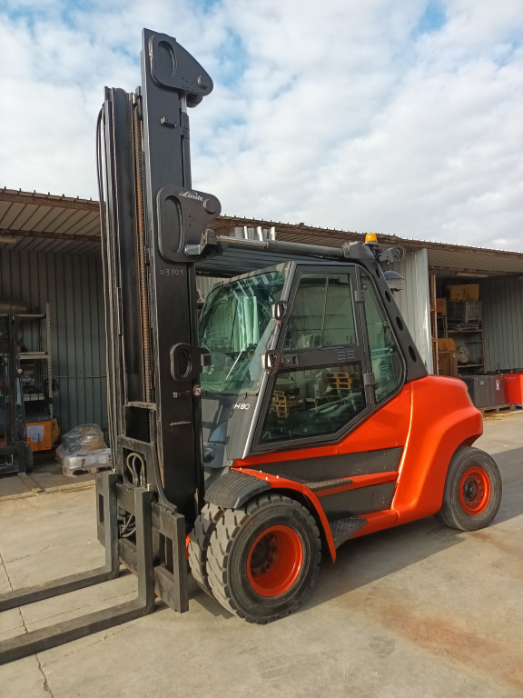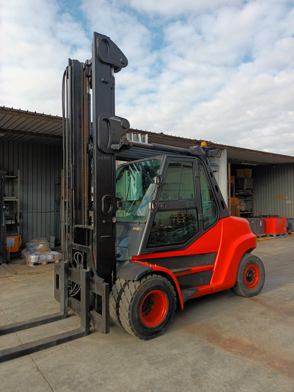 Carrelli diesel usati di marca Linde modello H80 D-02/900 S. 396 con propulsione Diesel, portata 80 q.li, altezza di sollevamento 5600 mm, a noleggio. Occasione.