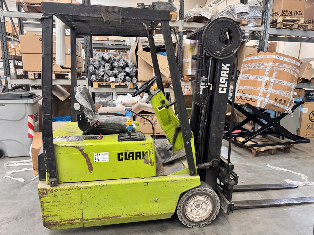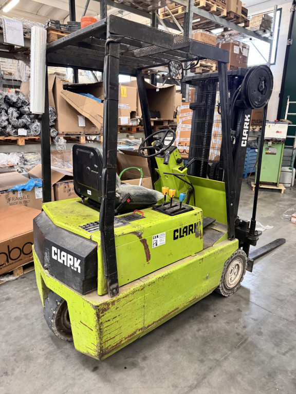 Carrelli elettrici usati di marca Clark modello Tm15 con propulsione Elettrica, portata 15 q.li, altezza di sollevamento 4300 mm, a noleggio. Occasione.