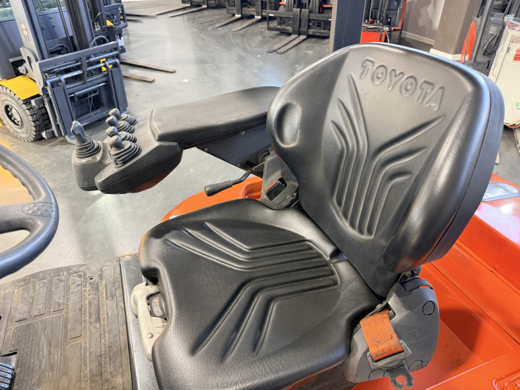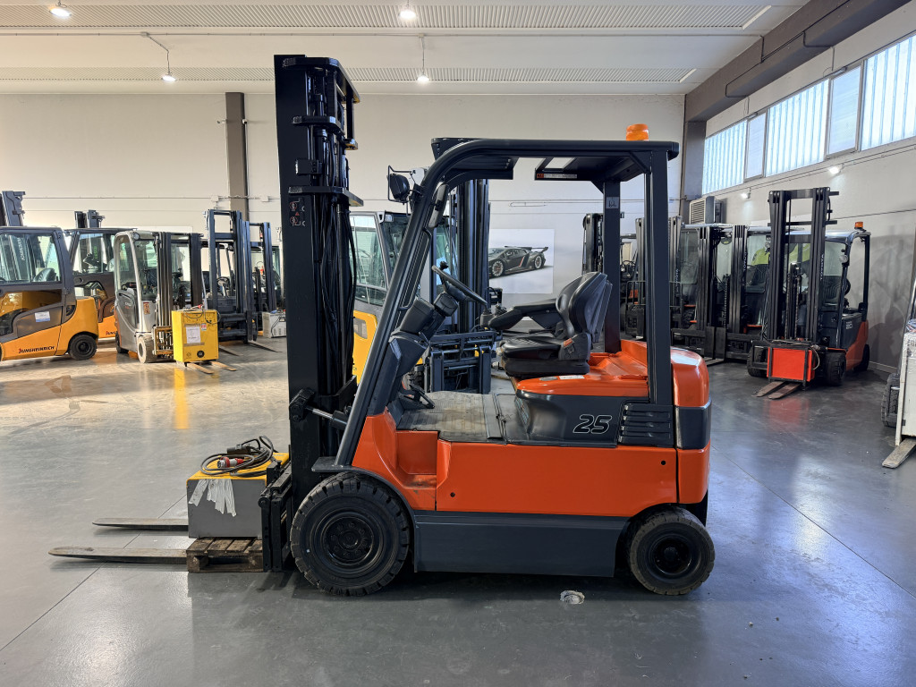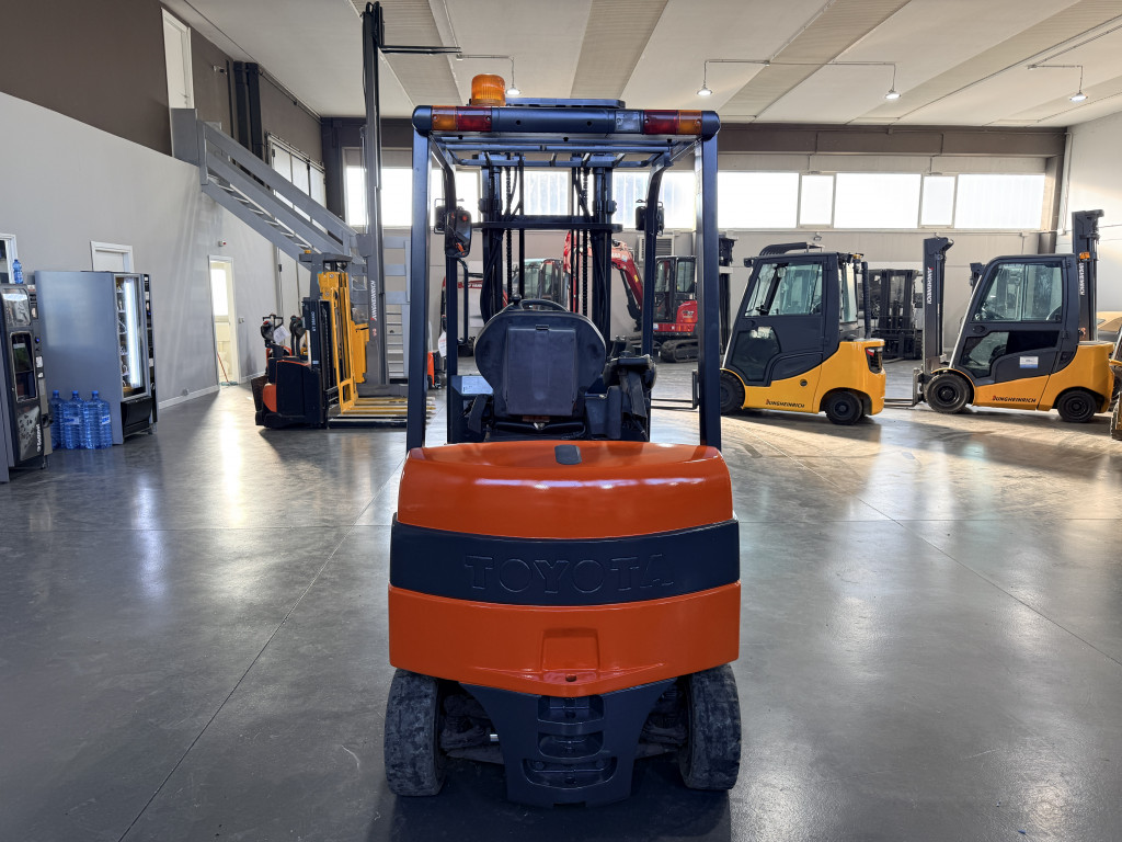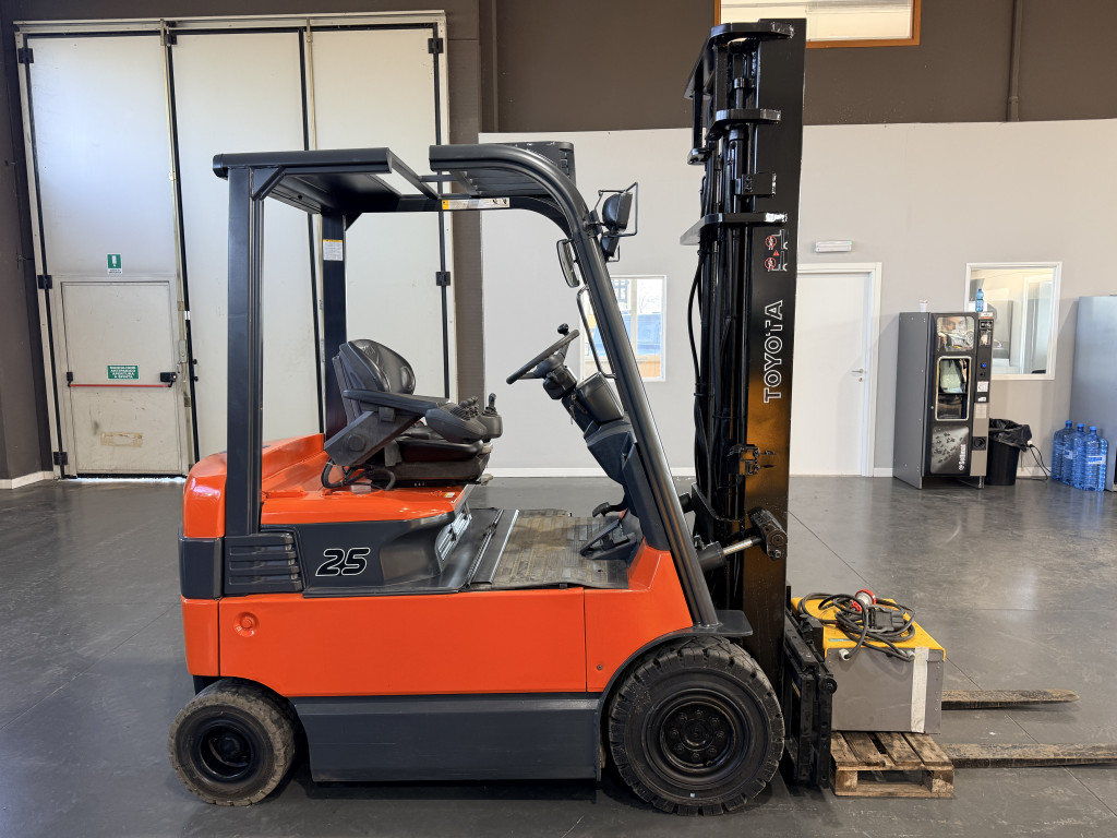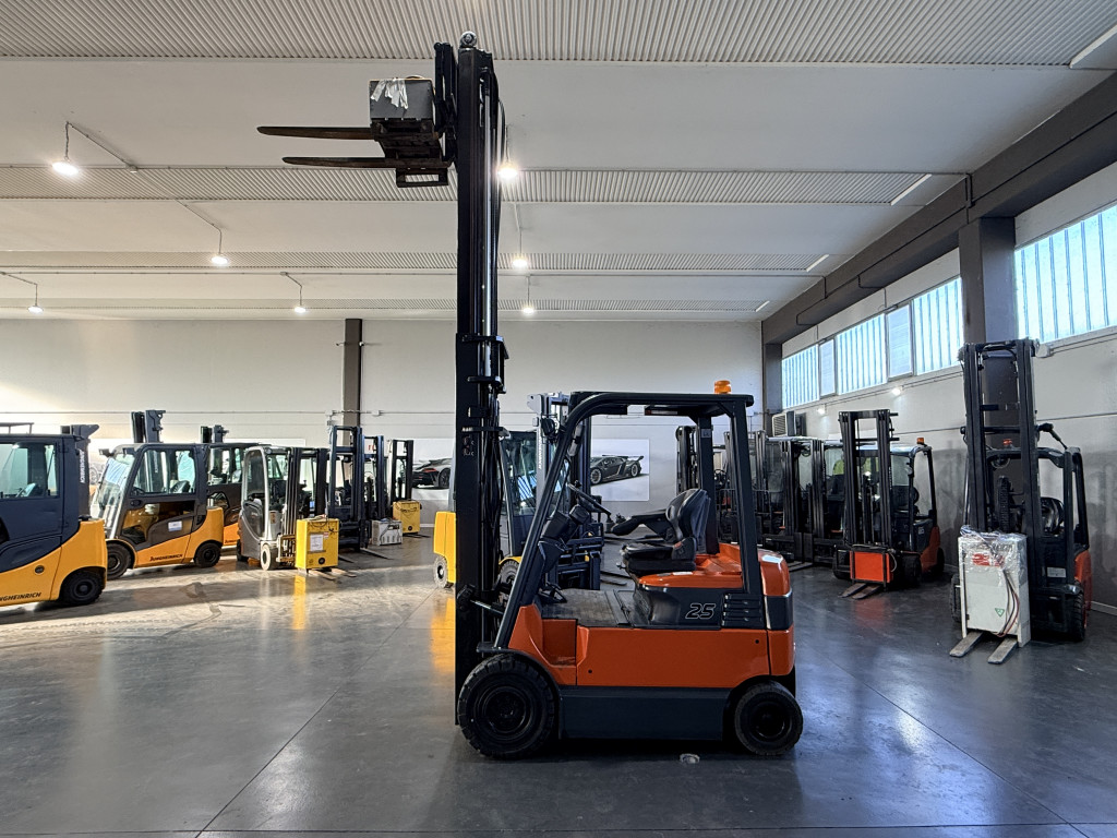 Carrelli elettrici usati di marca Toyota modello 7FBMF25 con propulsione Elettrica, portata 25 q.li, altezza di sollevamento 4000 mm, a noleggio. Occasione.