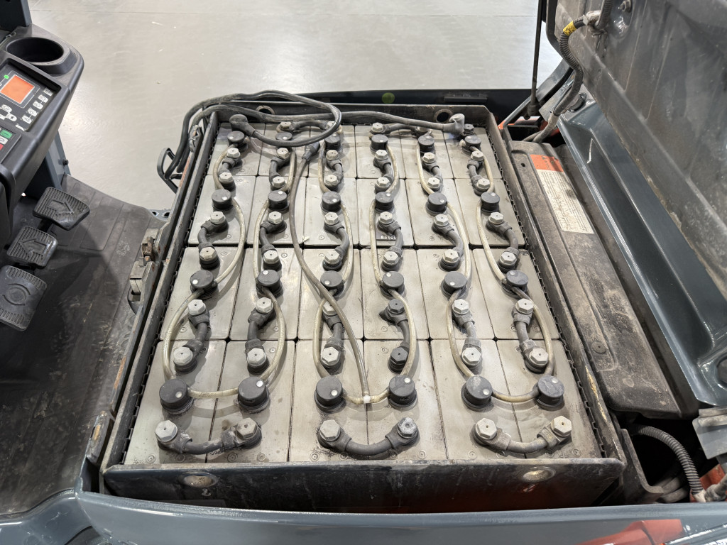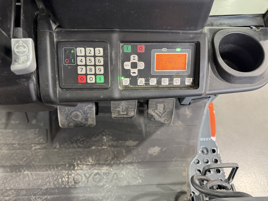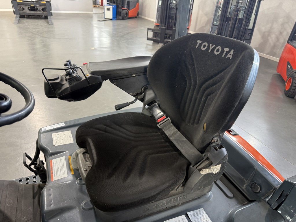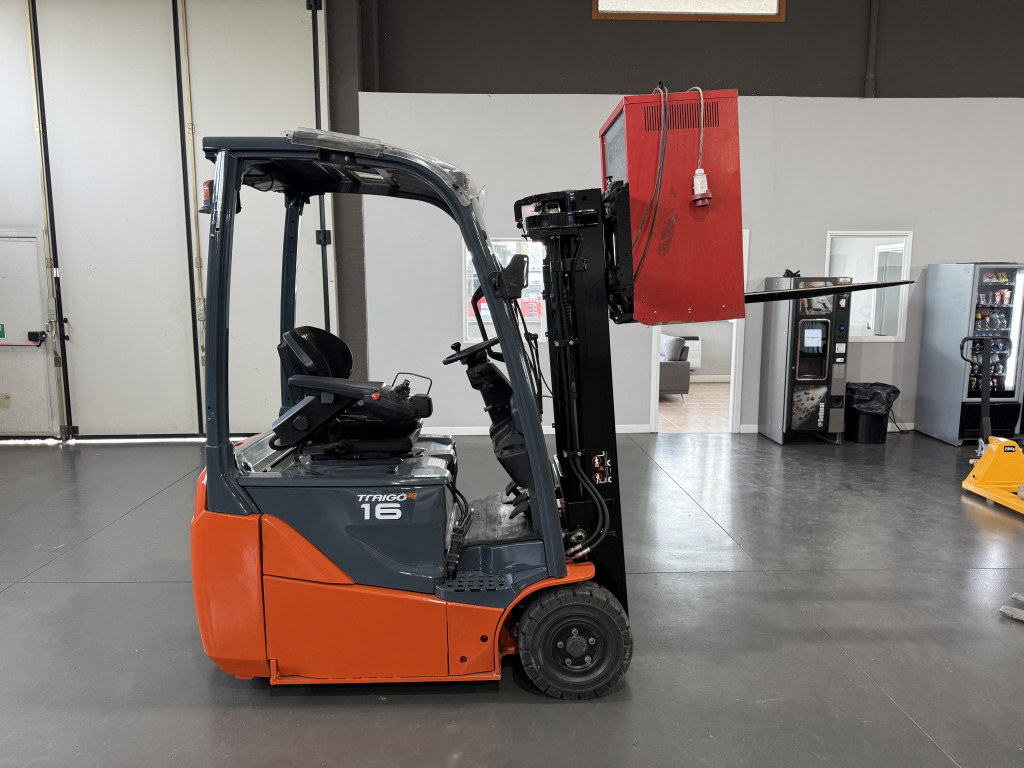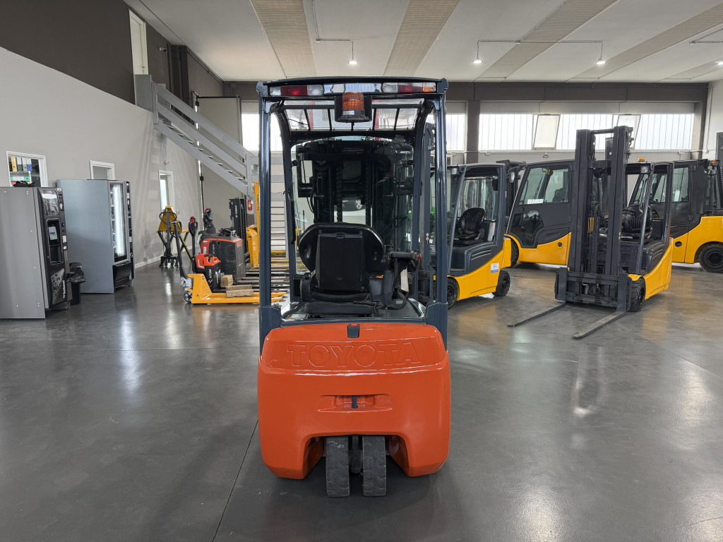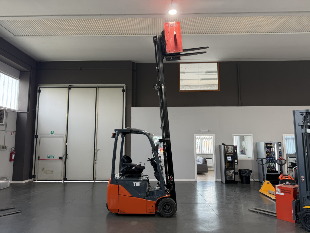 Carrelli elettrici usati di marca Toyota modello 8FBEK16T con propulsione Elettrica, portata 16 q.li, altezza di sollevamento 4500 mm, a noleggio. Occasione.