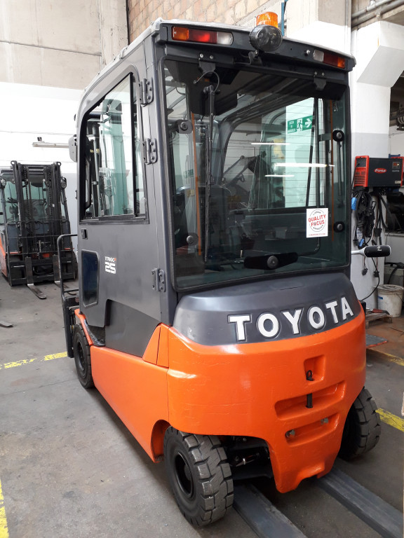 Carrelli elettrici usati di marca Toyota modello 8FBMT25 con propulsione Elettrica, portata 25 q.li, altezza di sollevamento 3300 mm, a noleggio. Occasione.