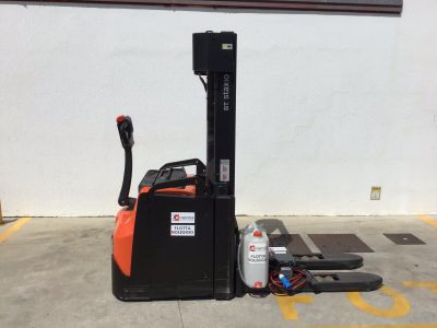Stoccatori uomo a piedi di marca Toyota modello SWE160L con propulsione ELETTRICA, portata 16 q.li, altezza di sollevamento 4150 mm, a noleggio. Occasione.