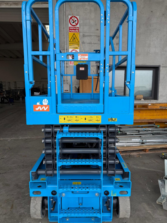 Piattaforma a pantografo di marca Sinoboom modello 3346 di portata 320 kg, con propulsione Elettrica, altezza di lavoro 12,00 mt, a noleggio.