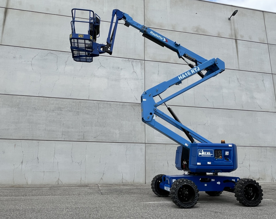 Piattaforma articolata di marca Haulotte modello HA16 RTJ di portata 230 kg, con propulsione Diesel, altezza di lavoro 1,60 mt, a noleggio.