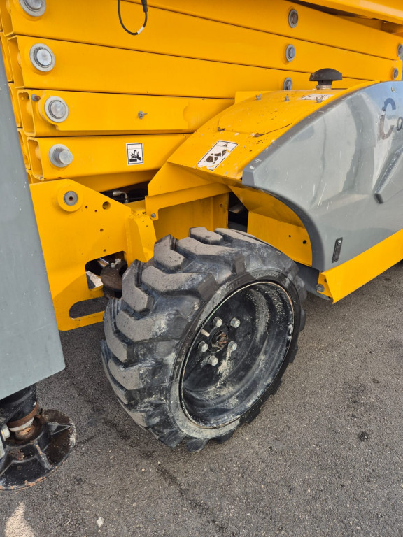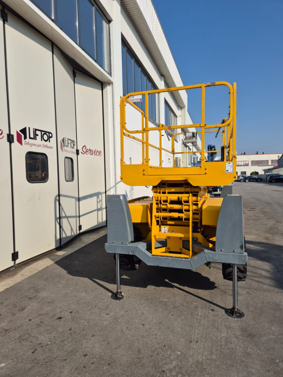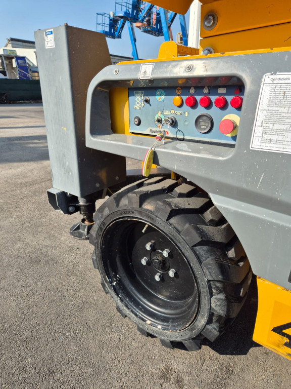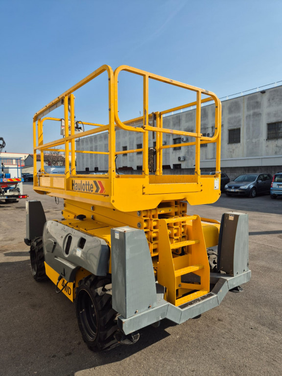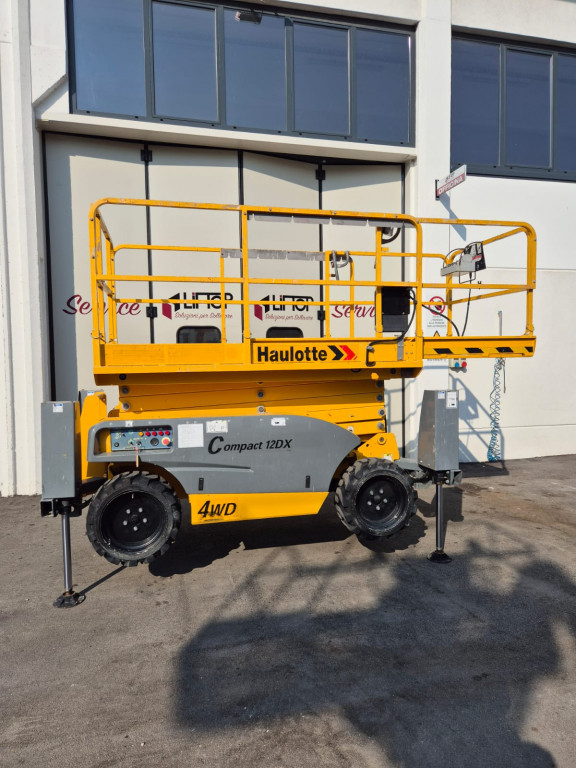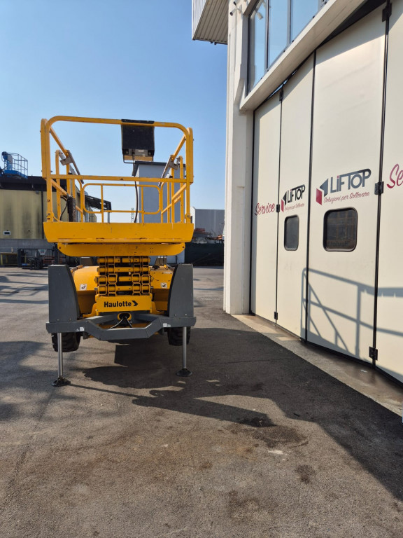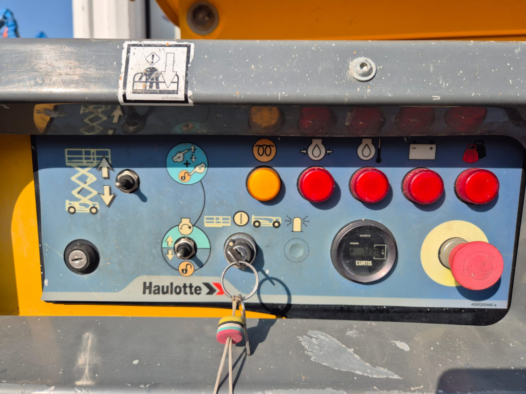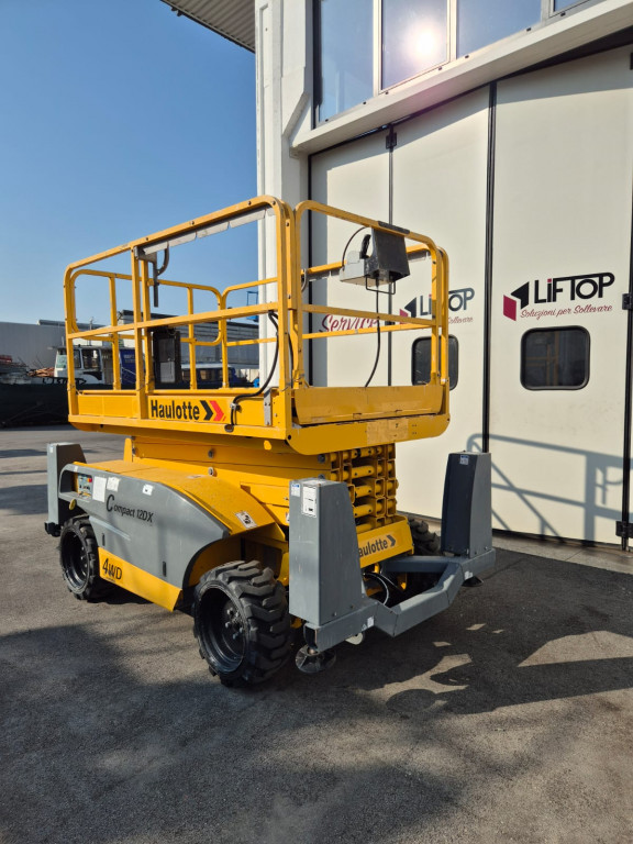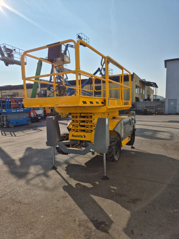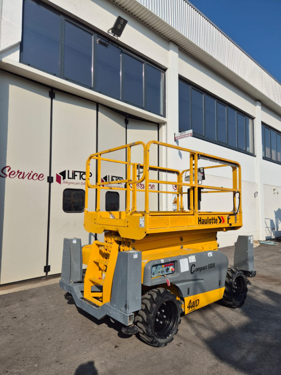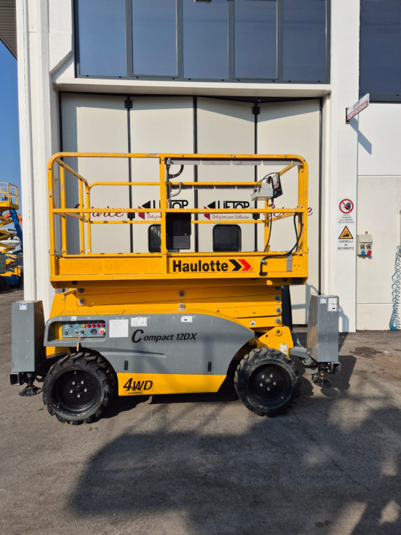 Piattaforma a pantografo di marca Haulotte modello Compact 12DX di portata 450 kg, con propulsione Diesel, altezza di lavoro 12,06 mt, in vendita.