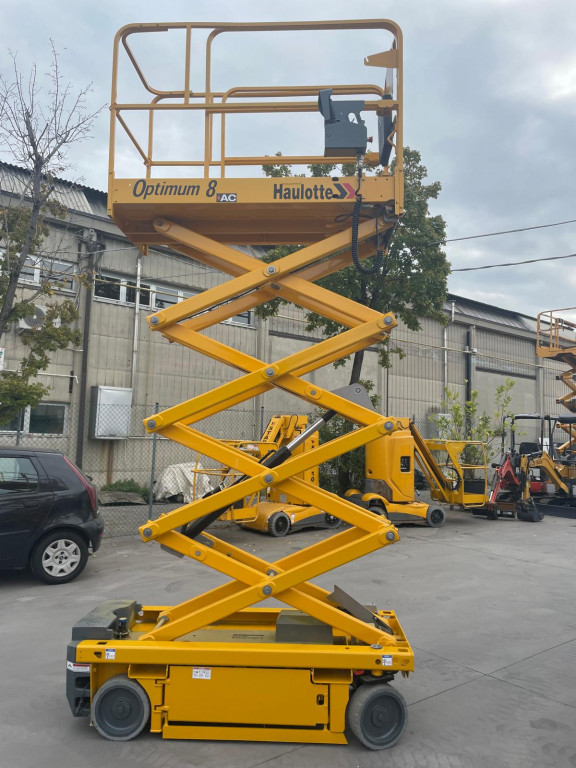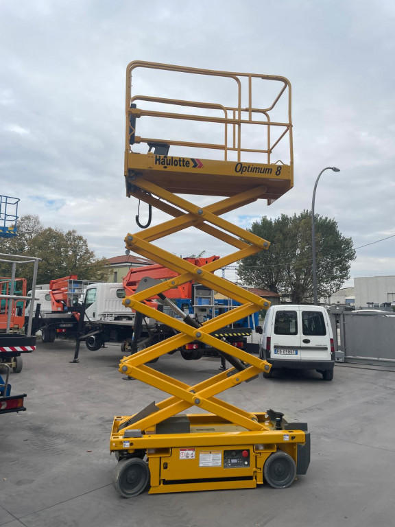 Piattaforma a pantografo di marca Haulotte modello OPTIMUM 8AC di portata 230 kg, con propulsione Elettrica, altezza di lavoro 8,00 mt, in vendita.