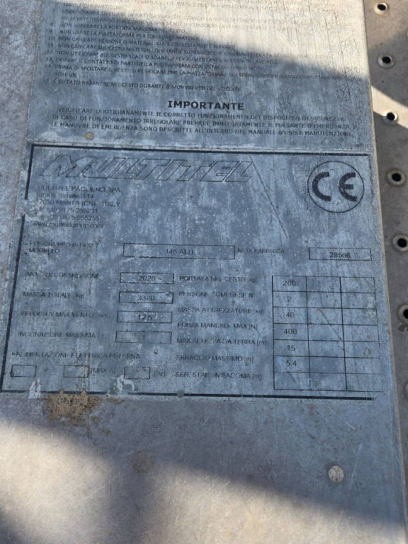 Piattaforma autocarrata articolata di marca Multitel modello ALU 145 di portata 200 kg, con propulsione Diesel, altezza di lavoro 14,70 mt, in vendita.