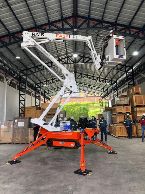 Piattaforma ragno cingolata di marca Easy Lift modello RA15 di portata 230 kg, con propulsione Diesel, altezza di lavoro 15,00 mt, in vendita.